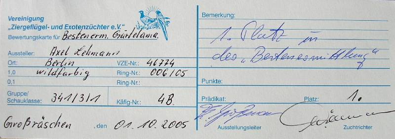 in der Schauklasse 251/3/1 (Alttiere).                           Beste Gürtelamadine der Schau