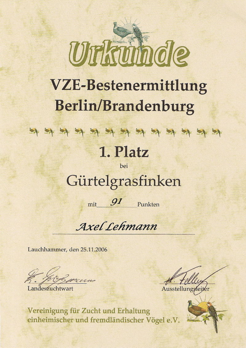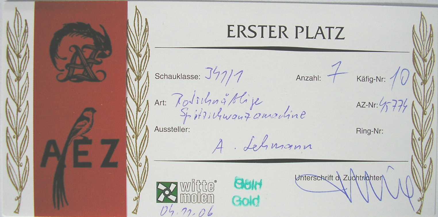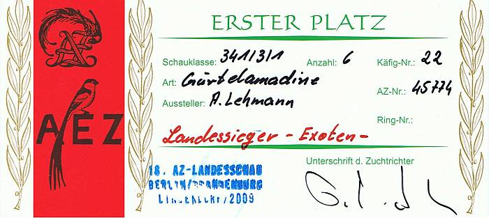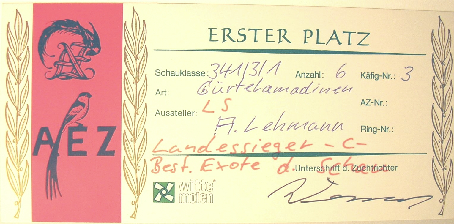 Ehrenpreis ,,Hervorragende Zuchtleistung'' vom AZ Zuchtrichter für Gürtelamadine und Perlhalsamadine